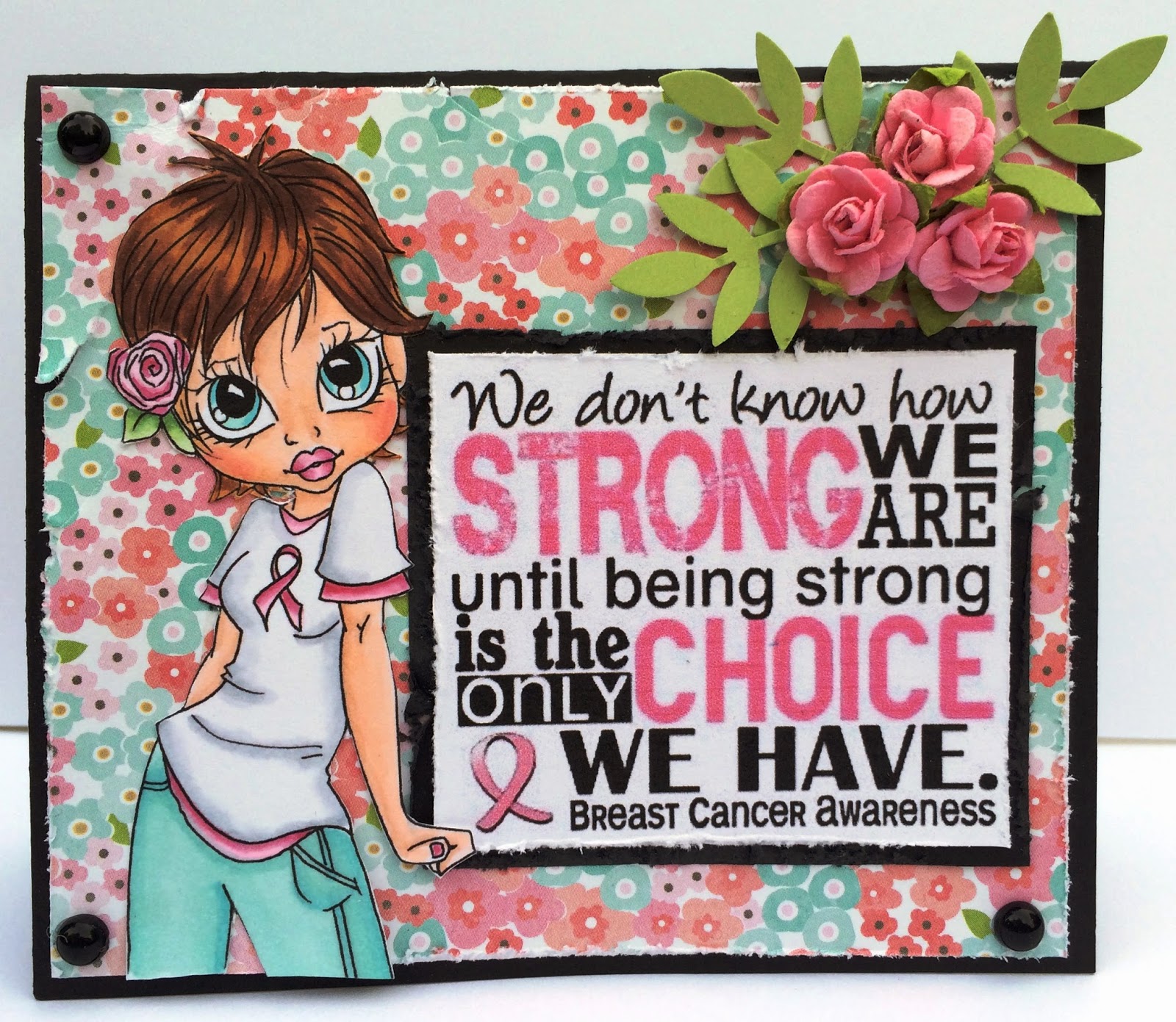 Happy Tuesday!!! I am a bit late posting today and I apologize for that. I just ran out of hours in the day! This week, Peggy picked "favorite embellishment" for the challenge. I am definitely someone who is embellishment challenged, and honestly, I only really use 2 embellishments on my cards, Flowers and gems. If I could just color and stick my picture on some DP, I would. Really, I just like to color and play with paper...LOL... With this weeks challenge being open to so many ideas, I went with a digi image I have had for a long time, and unfortunately, I have someone to give this card to. One of my coworkers (young), was recently diagnosed with breast cancer, and she has been so strong through the process thus far, and I just want to let her know that I think she is amazing and I am here for her, so this card is for her.